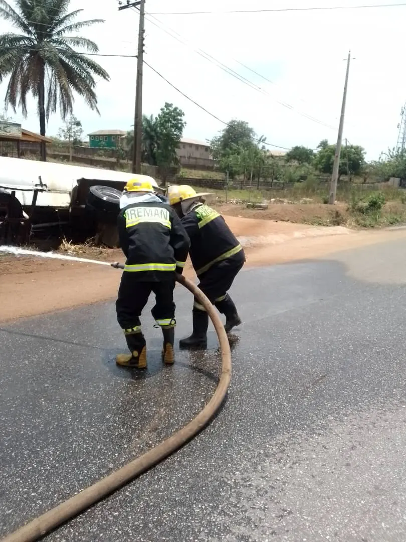 Upon arrival, emergency responders found a DAF trailer tanker (Reg No: SUL 698 XP Niger) overturned in a ditch, with fuel spilling rapidly. Firefighters immediately deployed foam compounds to neutralize the flammability and prevent an outbreak of fire.